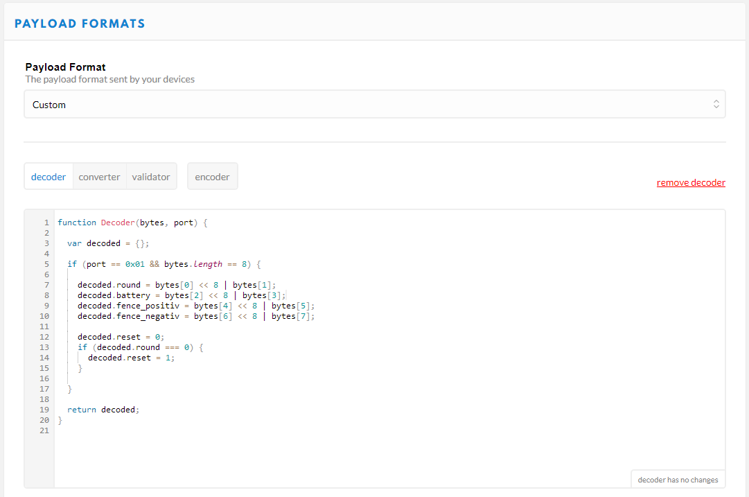 The other thing I didn't figure out immediately is the Payload Formats option in the TTN console. It lets you write simple javascript running inside The Things Network to decode your payload data and assign them to key-value pairs. When receiving a message through the HTTP Integration (or MQTT), that message will include the key-value pairs as json for easy consumption. Quite clever and easy to parse.