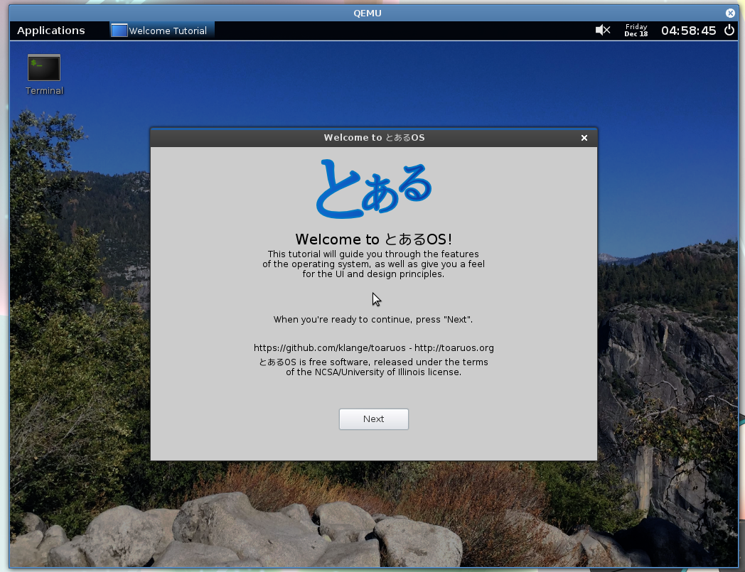 This is a pre-release demo: there are still many unimplemented features in とあるOS. We appreciate well-researched bug reports, but be mindful of the myriad known issues and limitations with this release. The Live CD requires at least 256MB of RAM and a display setup that supports a 1024x768x32bpp mode through VBE (if you're using QEMU, that means you'll need "-vga std"). No permanent installation methods are offered at this time. The Live CD has been tested under QEMU and VirtualBox, but other emulators should work. If you wish to use the live CD on real hardware, you will need a PS/2 keyboard and mouse (or compatible configuration) - be aware that we have not had the opportunity to test とあるOS on a wide variety of hardware.