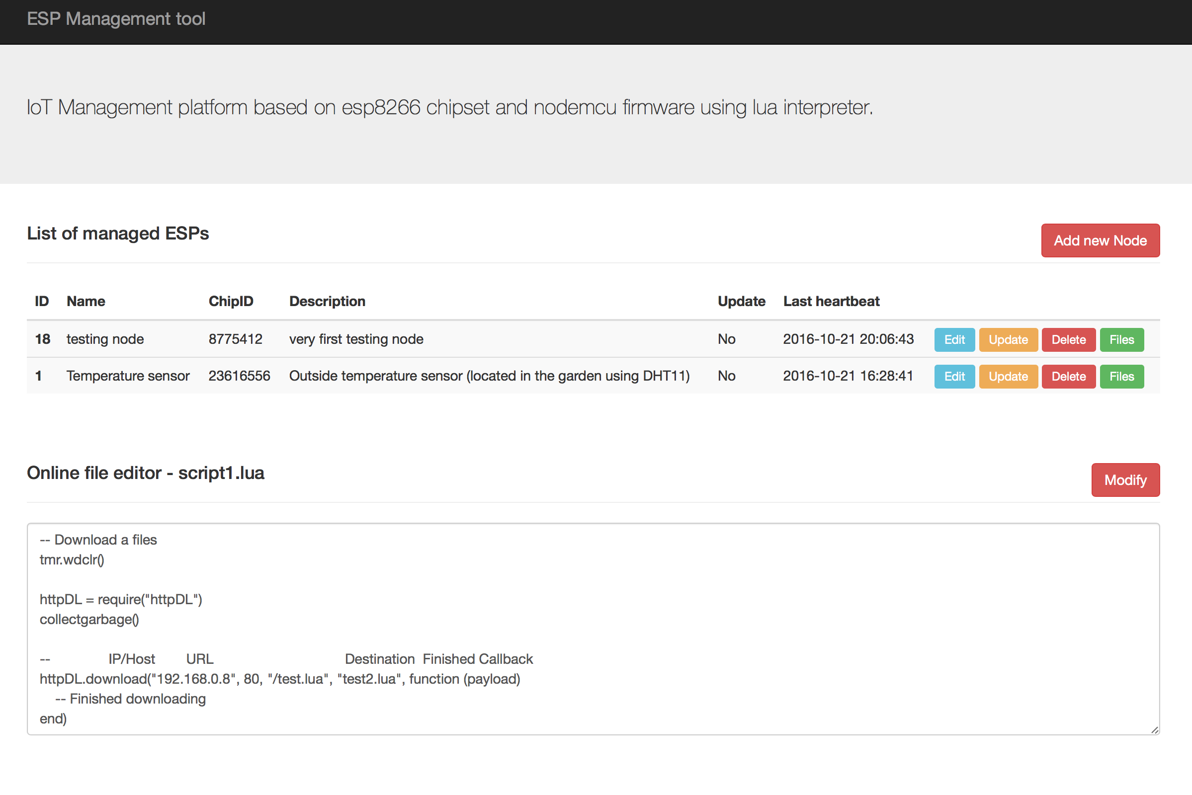 As soon as you configure basic configuration to your esp8266, open management UI on your server, create a new node, use the chipid you copy and add some files you can you use simple script2.lua stored in WebUI_MNG/uploads/script2.lua Please note that you should mark the file with boot flag (if not then first file will be used as bootscript(it's a lua script which will be start automatically)). Using the UI you are able also edit script files and also do remote upgrade. To upgrade the esp just use UPDATE button. Heartbeat info show you the timestamp of last update check of your esp. If Update is marked as Yes, then next time the esp will be updated.