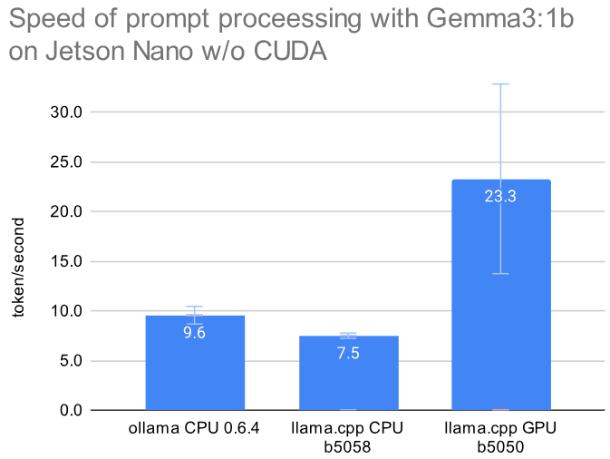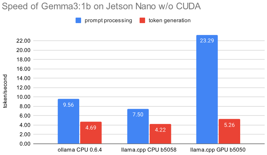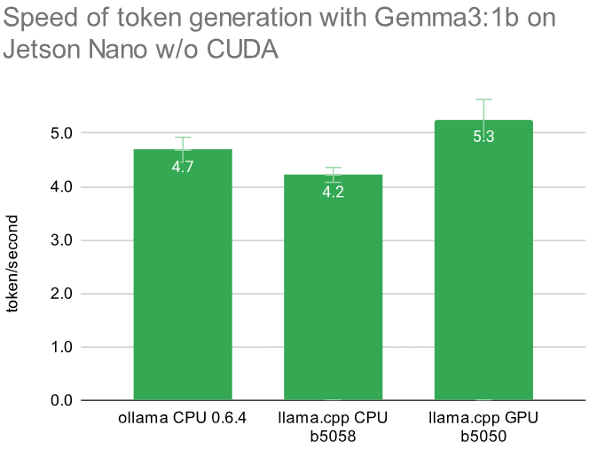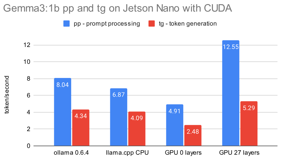 As of April 2025 the current version of llama.cpp can be compiled for the Jetson Nano from 2019 with GPU/CUDA support using gcc 8.5 and nvcc 10.2. Here is a list of a few earlier solutions with description, sorted by their build date. Their performance is later compared in benchmarks: