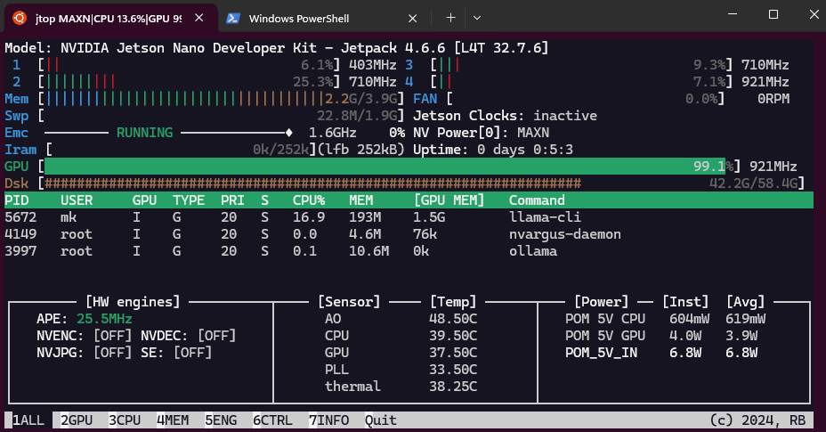 The Jetson Nano indeed uses the GPU (footnote 1) to generate tokens with 100% GPU load, 1.5 GB GPU memory and 4 Watt power usage, while the CPU is only used in the 14% range with 0.6 Watt. It is on average 20% faster than the pure CPU use with ollama or a CPU build - see the benchmark section below!