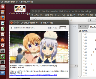 ご注文はうさぎですか?1期・2期・Dear My Sister・Sing for You・3期 の全画像170万枚以上を対象とした検索エンジン ごちうサーチ です。Windows/Mac/Linux で動作します。 アプリケーションにキャプチャ画像をブラウザやフォルダからDrag&Dropすると、 何羽のどのあたりかを返します。 また、自動的にニコニコ動画/dアニメストア/Amazon prime/dアニメストア ニコニコ支店 の該当部分に移動することもできます。