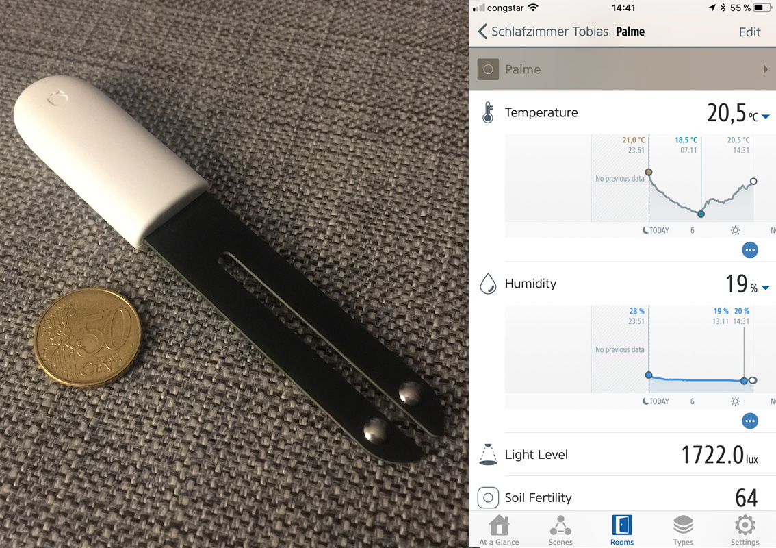 This is a Homebridge plugin for exposing the Xiaomi Flower Care / Flower Mate / Flower Monitor / Mi Flora devices to HomeKit. Historical display of temperature / moisture data is available via HomeKit apps that support graphing (e.g. Elgato Eve).