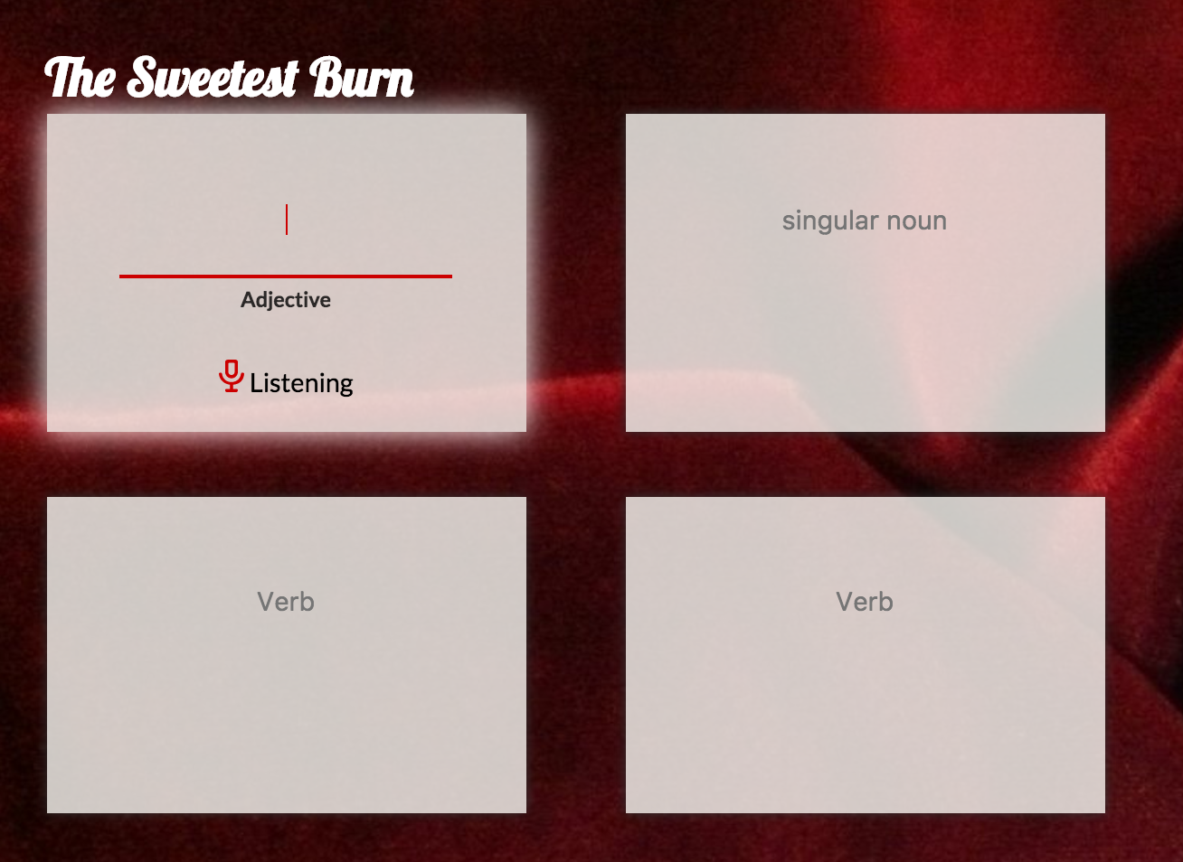 MadTalk is a fun take on MadLibs: the app prompts the user to provide whimsical words that replace words in a text snippet. The text snippets are drawn from saucy romance novel synopses. The app uses the browser's speech recognition interface (supported by chrome) which allows the user to input the words by speaking. The app then reads the completed game.
