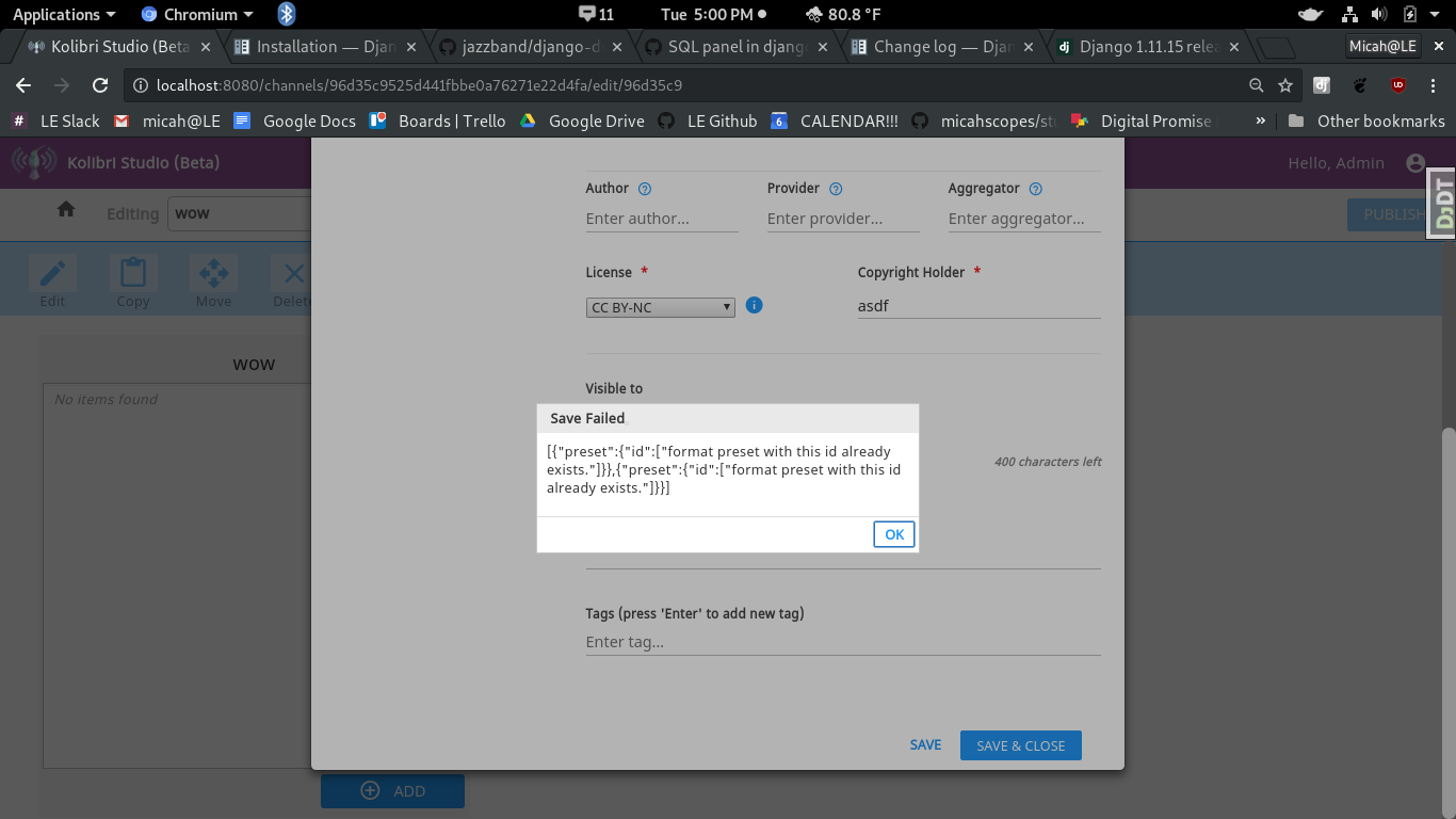 Steps to reproduce: 1. Upload some content to a channel (PDF, video, etc.) 2. Click along to edit metadata 3. Attempt to save...