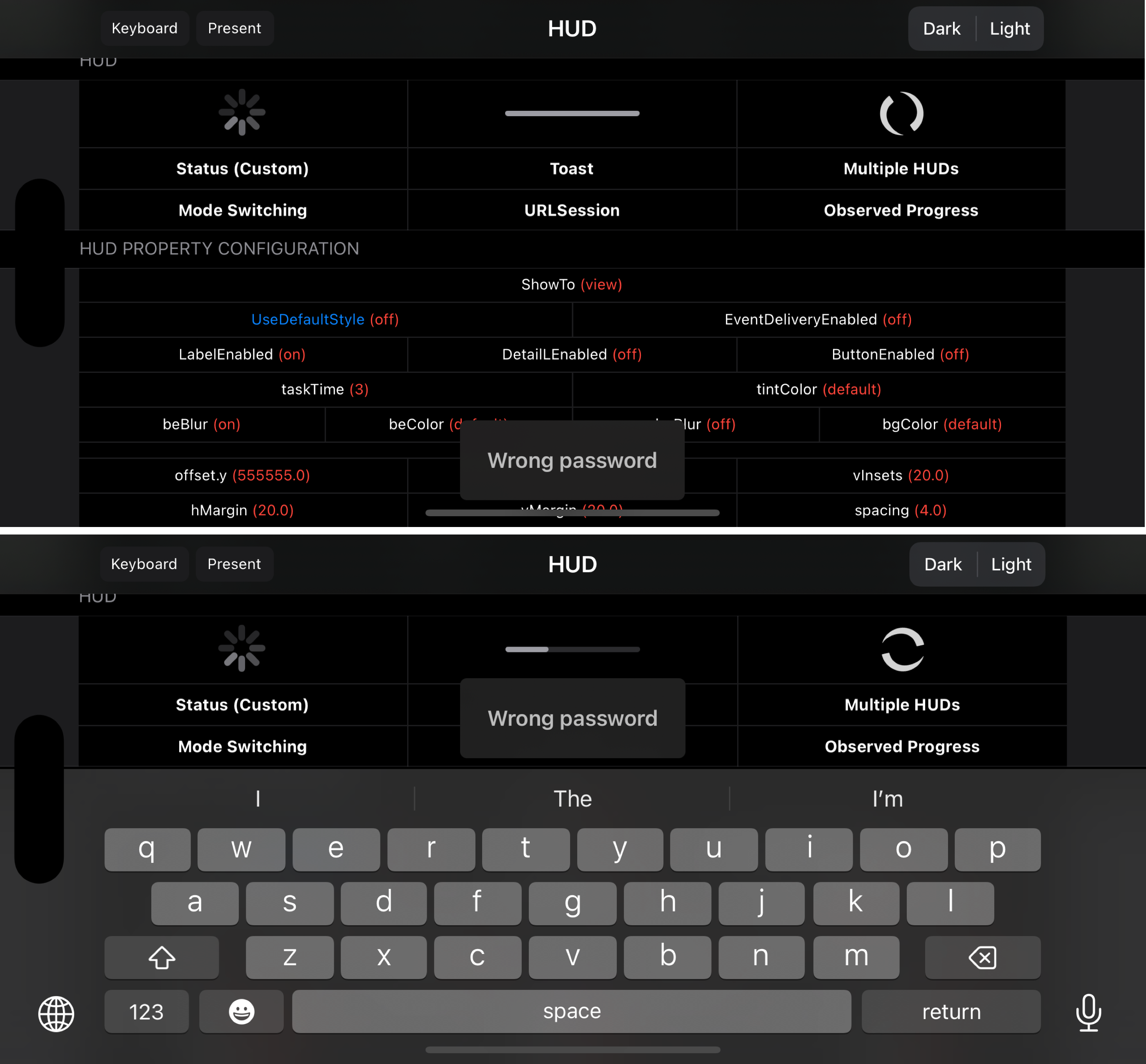 HUD.showStatus(to: view, label: "Wrong password")- Displays a custom view's status HUD. e.g. a UIImageView: