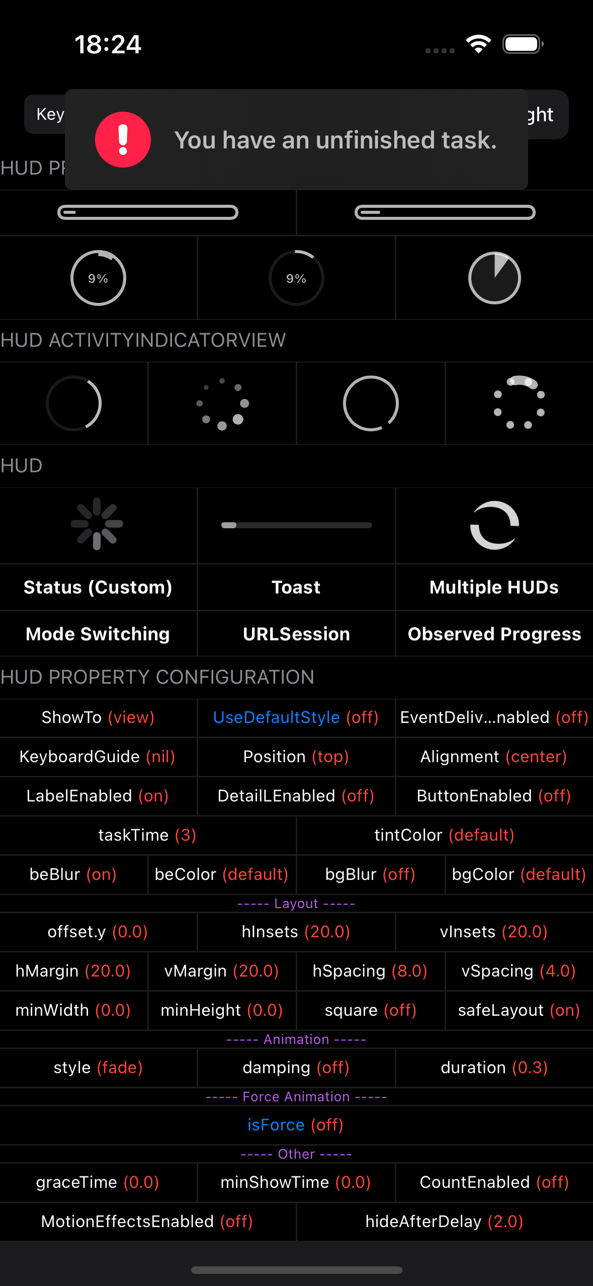 HUD.showStatus(to: view, mode: .custom(UIImageView(image: UIImage(named: "warning"))), label: "You have an unfinished task.") {