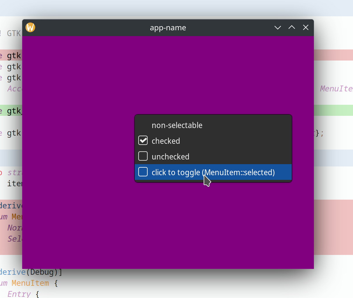 gtk::prelude::IsA<gtk::MenuItem> + gtk::prelude::IsA<gtk::Widget>trait object then this could be a lot shorter, but I couldn't get that to work.Technically checkbox menu entries should have a distinct unchecked state (at least in GTK), but I didn't see a distinction in druid's MenuItem which would allow for that so these do not.
