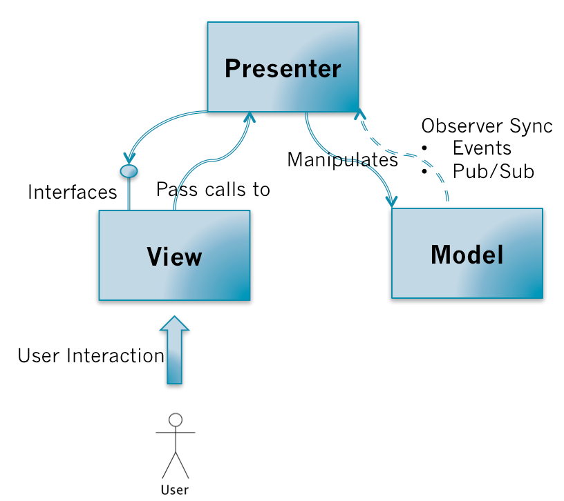 和MVC模式一样,用户对View的操作都会从View交移给Presenter。Presenter会执行相应的应用程序逻辑,并且对Model进行相应的操作;而这时候Model执行完业务逻辑以后,也是通过观察者模式把自己变更的消息传递出去,但是是传给Presenter而不是View。Presenter获取到Model变更的消息以后,通过View提供的接口更新界面。
