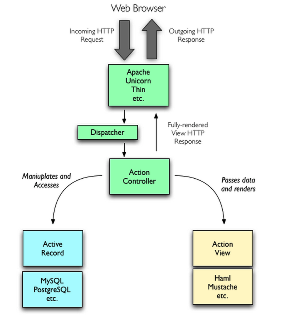 服务端接收到来自客户端的请求,服务端通过路由规则把这个请求交由给特定的Controller进行处理,Controller执行相应的应用逻辑,对Model进行操作,Model执行业务逻辑以后;然后用数据去渲染特定的模版,返回给客户端。
