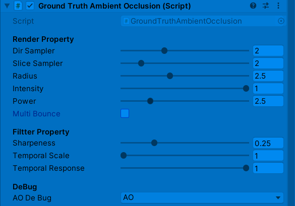 GTAO(GroundTruth-Oclusion)在HBAO基础上增加余弦项Cosine Weight操作使AO计算的物理性更精准,同时还增加了AO的MutiBounce弹射效果。另外,在AO基础上增加了RO(ReflectionOcclusion)。可以利用双边滤波,Temporal滤波来优化最终AO。
