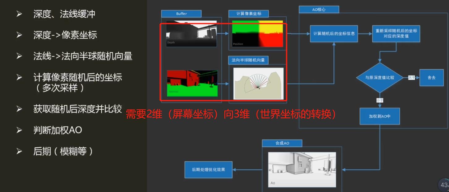法线缓冲:重构每像素“法线-切线-副法线”构成的坐标轴,用以计算法线半球采样的随机向量(描述该像素AO强度)