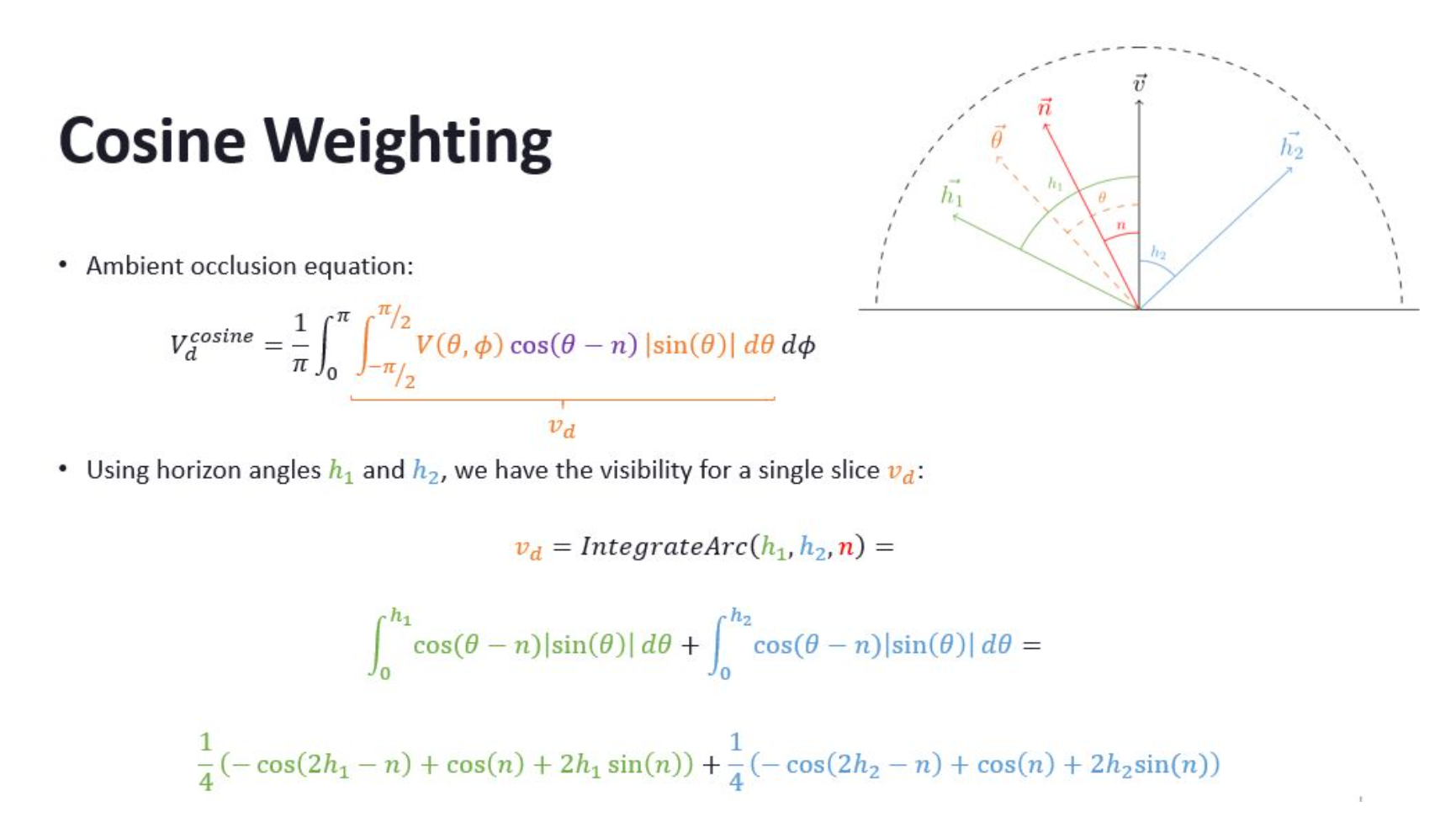 得到每个切面上的两个最大水平角后,就可以在切面上进行积分,计算当前切面上的AO值。(Cosine Weighting)。