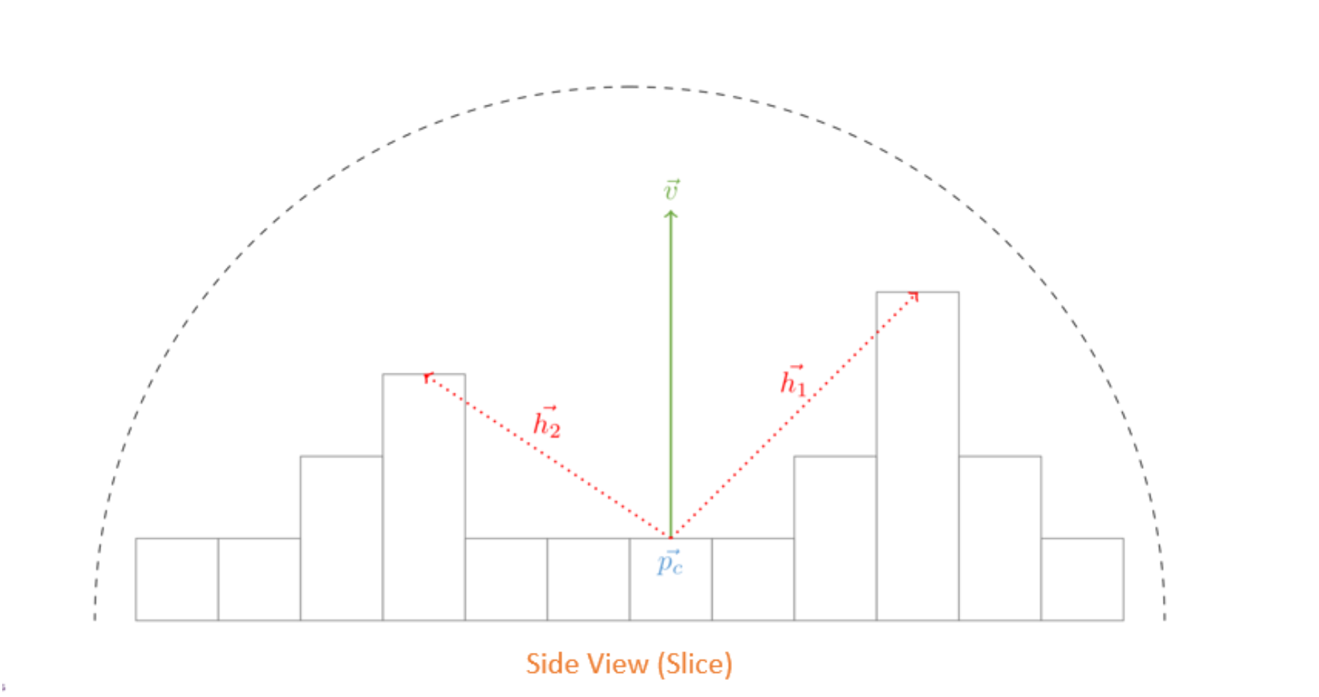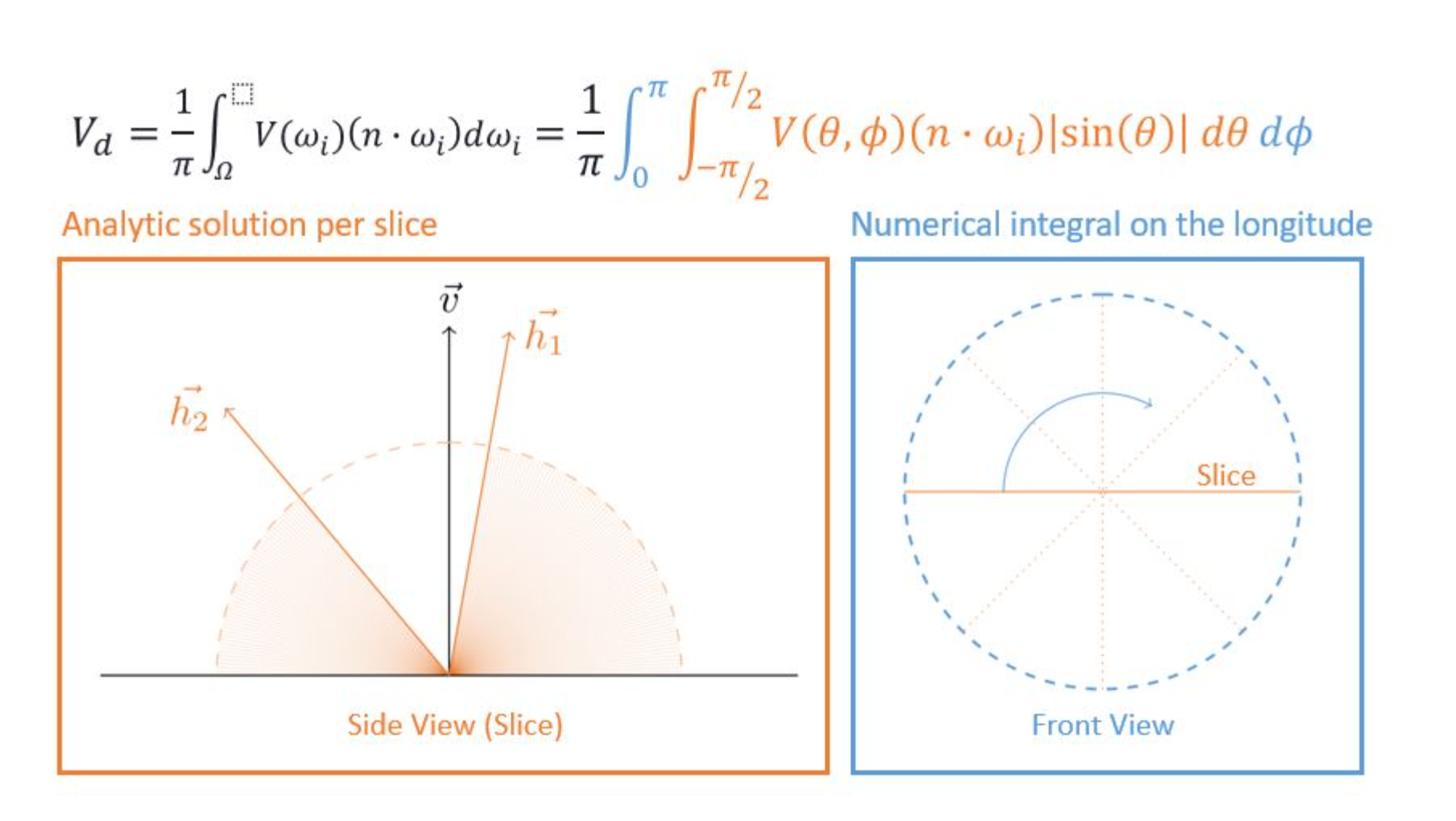 在每个切面上,寻找两端未被遮挡住的角度,称为水平角(horizonal angle),计算每个切片上的AO值,再将所有切片上的结果进行积分。