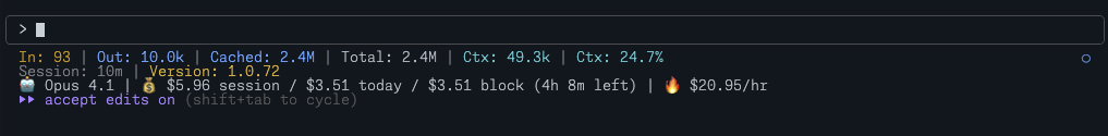 ccusage is a tool that tracks and displays Claude Code usage metrics. You can integrate it directly into your status line: