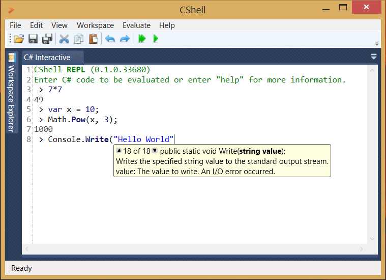 CShell is an interactive C# scripting environment. It allows you to use C# without any fluff right in a console like environment called a read-eval-print-loop (REPL). Your code is directly evaluated and executed in a shell window, no separate executable has to be compiled and then run in a different process. More elaborate code can be written in a C# script and then evaluated as one file, only one line, or a selection. Then, your results can be easily dumped to HTML (like LINQPad) or viewed as a data grid or plotted to a chart.
