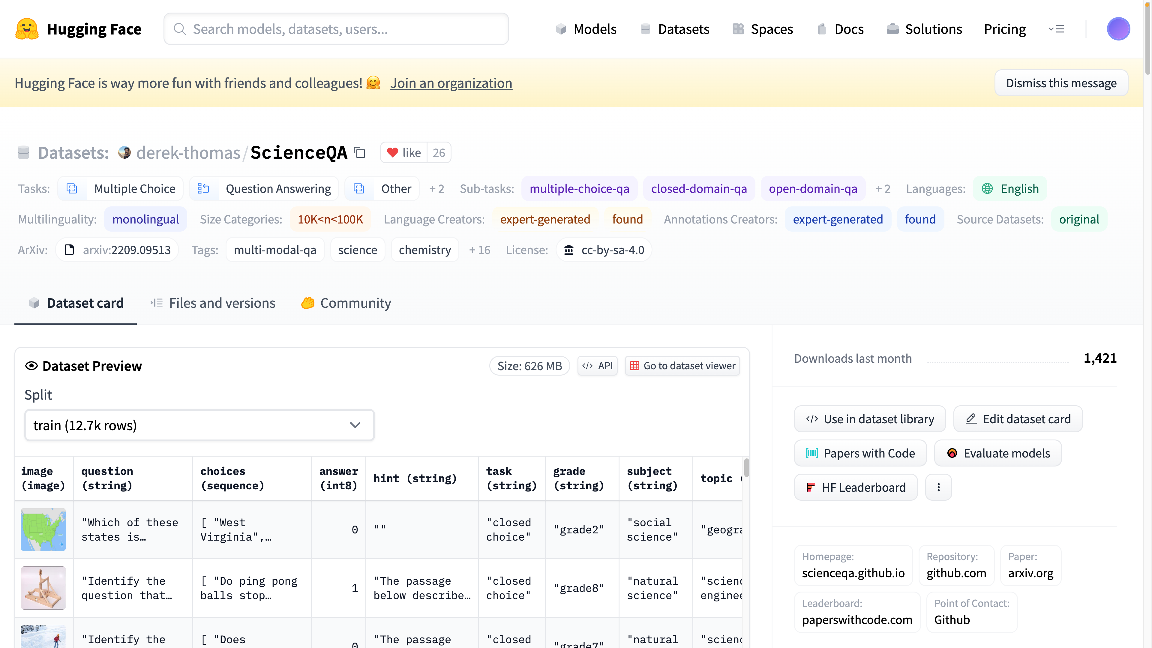 π₯ The ScienceQA dataset is now available at HuggingFace Datasets!