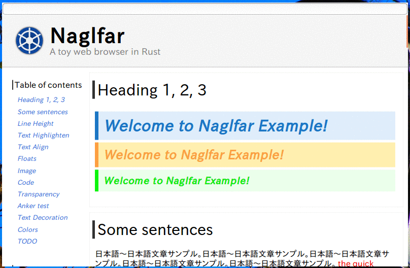 $ cargo run file://`pwd`/example/test.htmlGive the html file on the Internet: (But most of web sites are too much for Naglfar...)