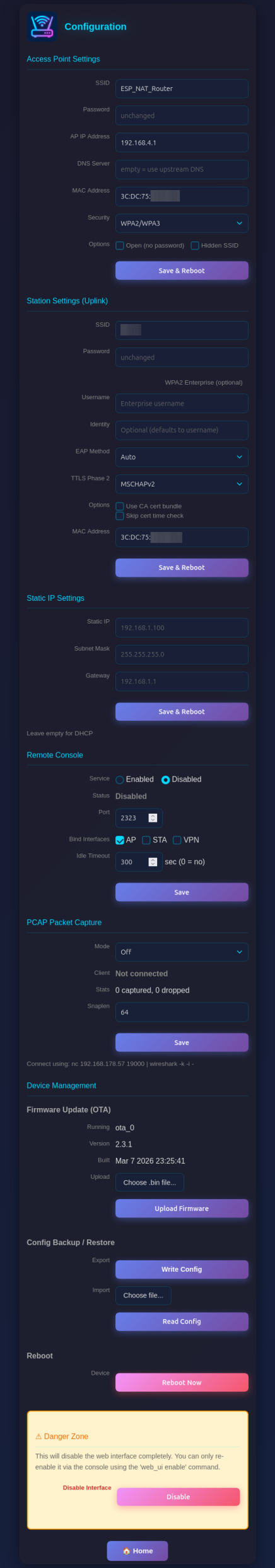 - Device Management: Config backup/restore, reboot, and danger zone (disable web interface)