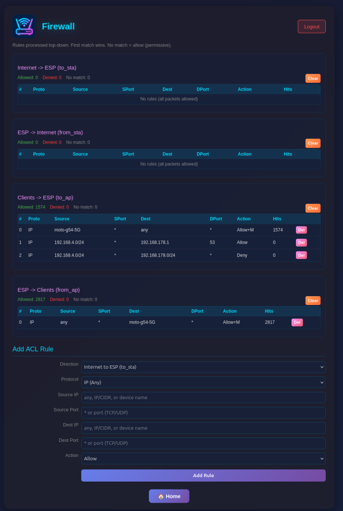 - Four ACL Lists: Control traffic in each direction (to_esp, from_esp, to_ap, from_ap)