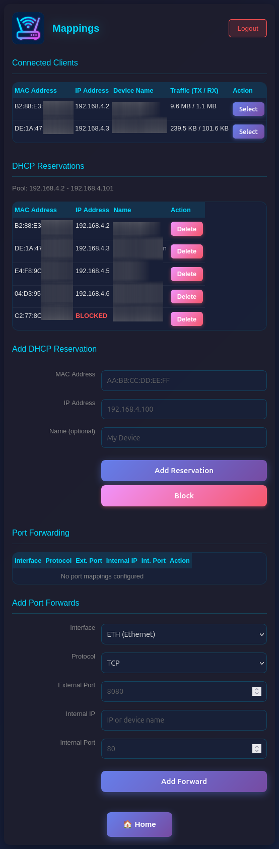 - DHCP Reservations: Assign fixed IP addresses to specific MAC addresses (useful for servers/devices that need consistent IPs). Blocked clients show BLOCKED in red. Make sure you assign port numbers in the range of the DHCP pool.