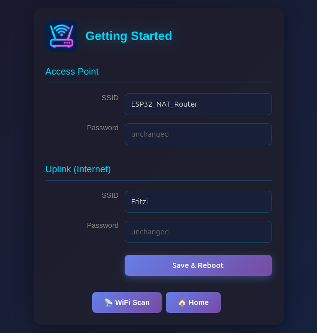 The web interface allows for the configuration of all parameters. Connect your PC or smartphone to the WiFi SSID "ESP32_NAT_Router" and point your browser to "http://192.168.4.1" (or later the configured AP IP address).