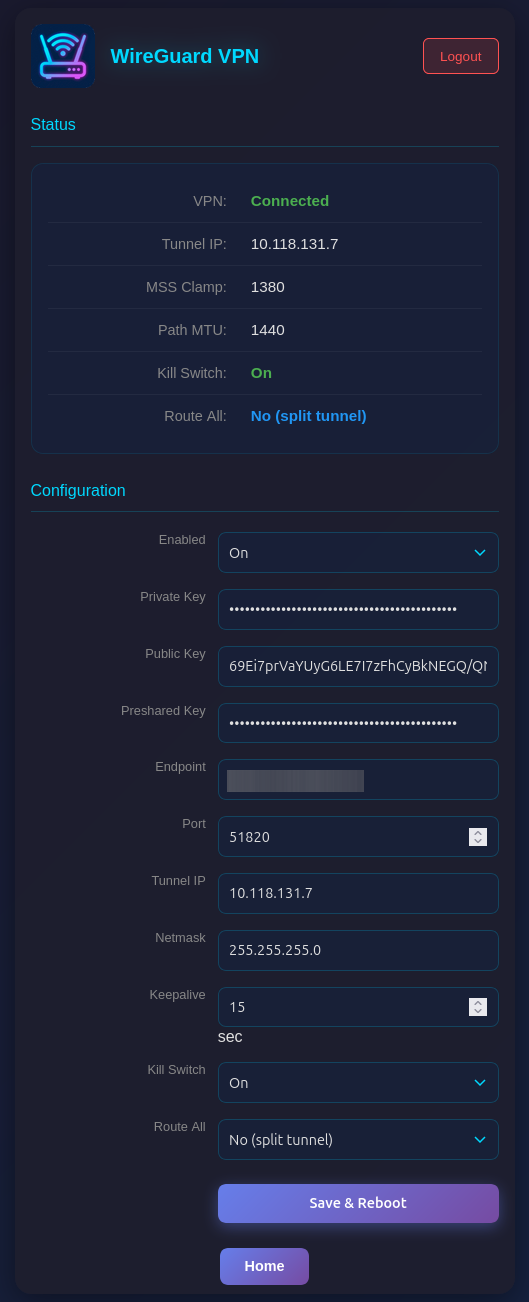 - Configuration: Enable/disable, private key, public key, preshared key (optional), endpoint, port, tunnel IP, netmask, keepalive