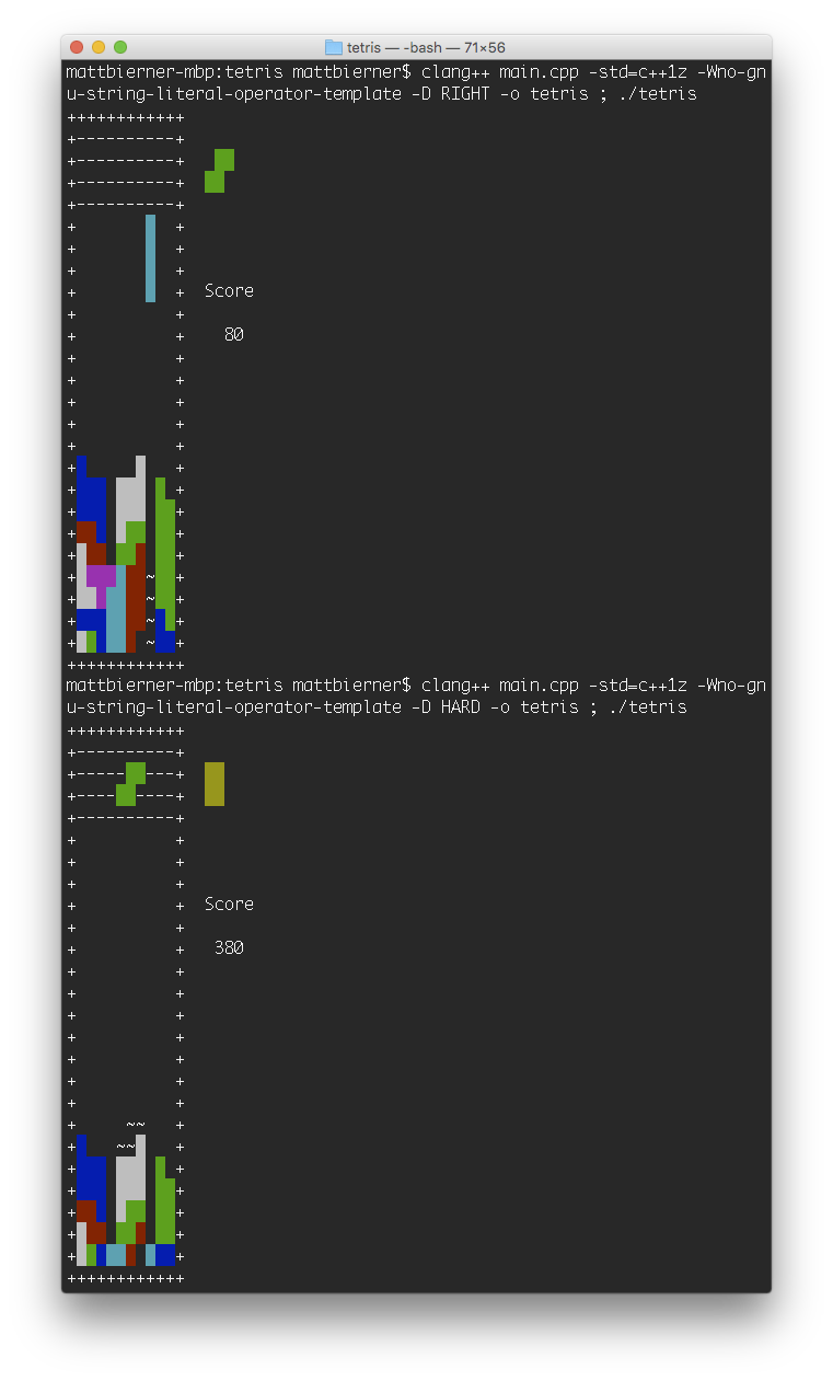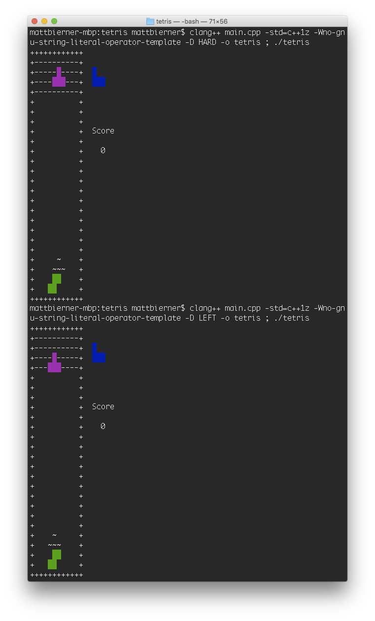$ clang++ main.cpp -std=c++1z -Wno-gnu-string-literal-operator-template -D COMMAND -o tetris ; ./tetris