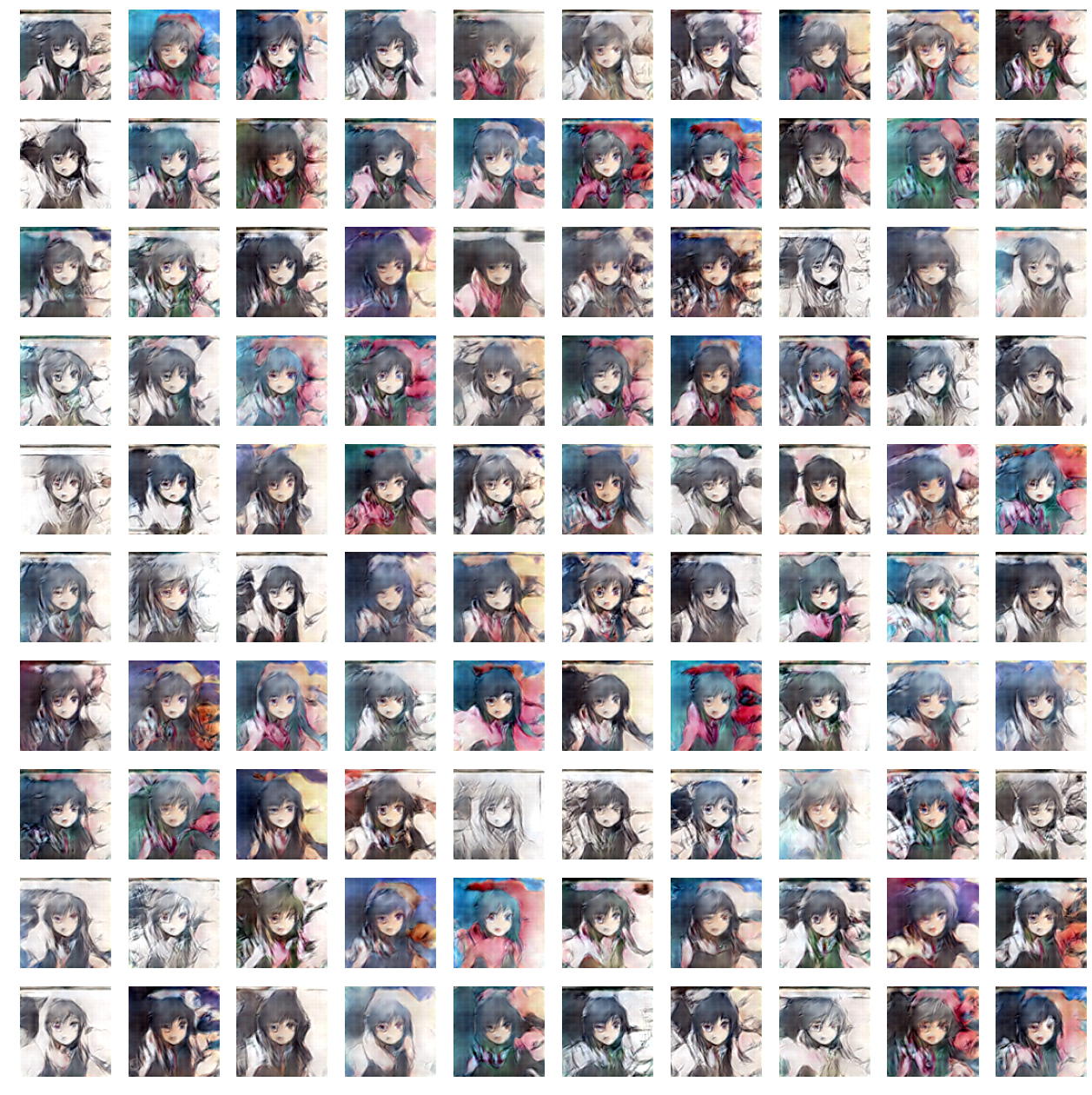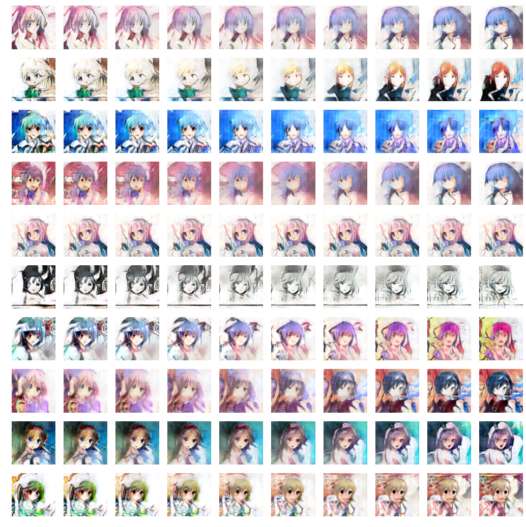特定の画像の生成元となったベクトルzにノイズを加えると、髪型や服装などが少しずつ異なる画像を生成できる。