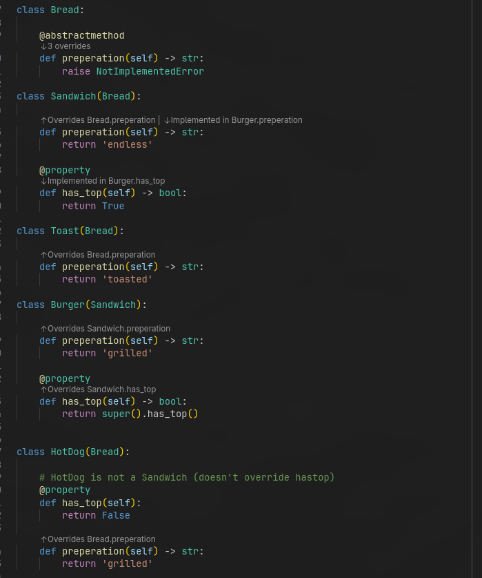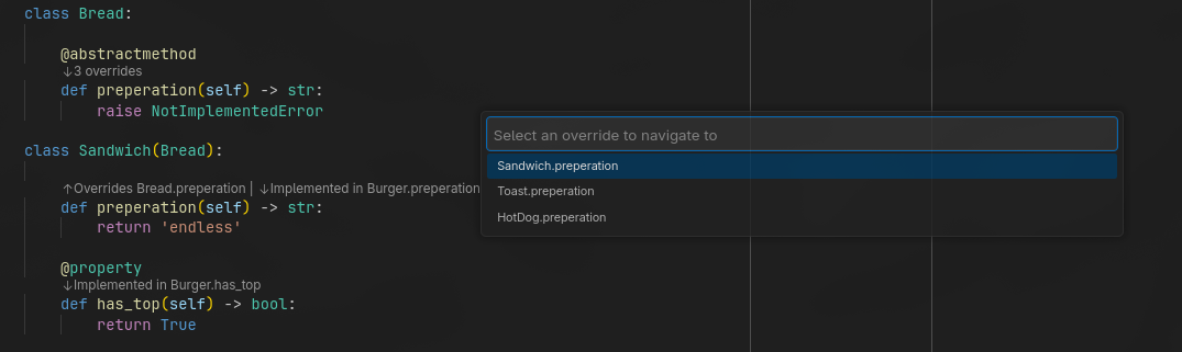 - Overrides: Click the "Overrides Parent.method" CodeLens to navigate to the parent definition.