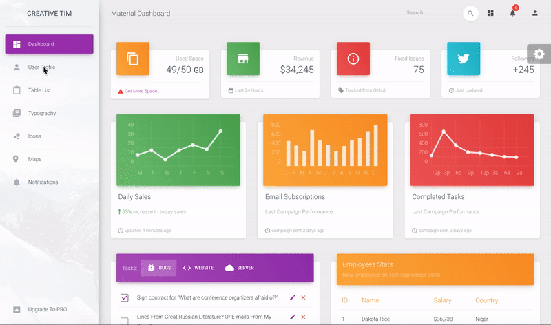 This product came as a result of users asking for a material dashboard after we released our successful Material Kit. We developed it based on your feedback and it is a powerful bootstrap admin dashboard, which allows you to build products like admin panels, content managements systems and CRMs.
