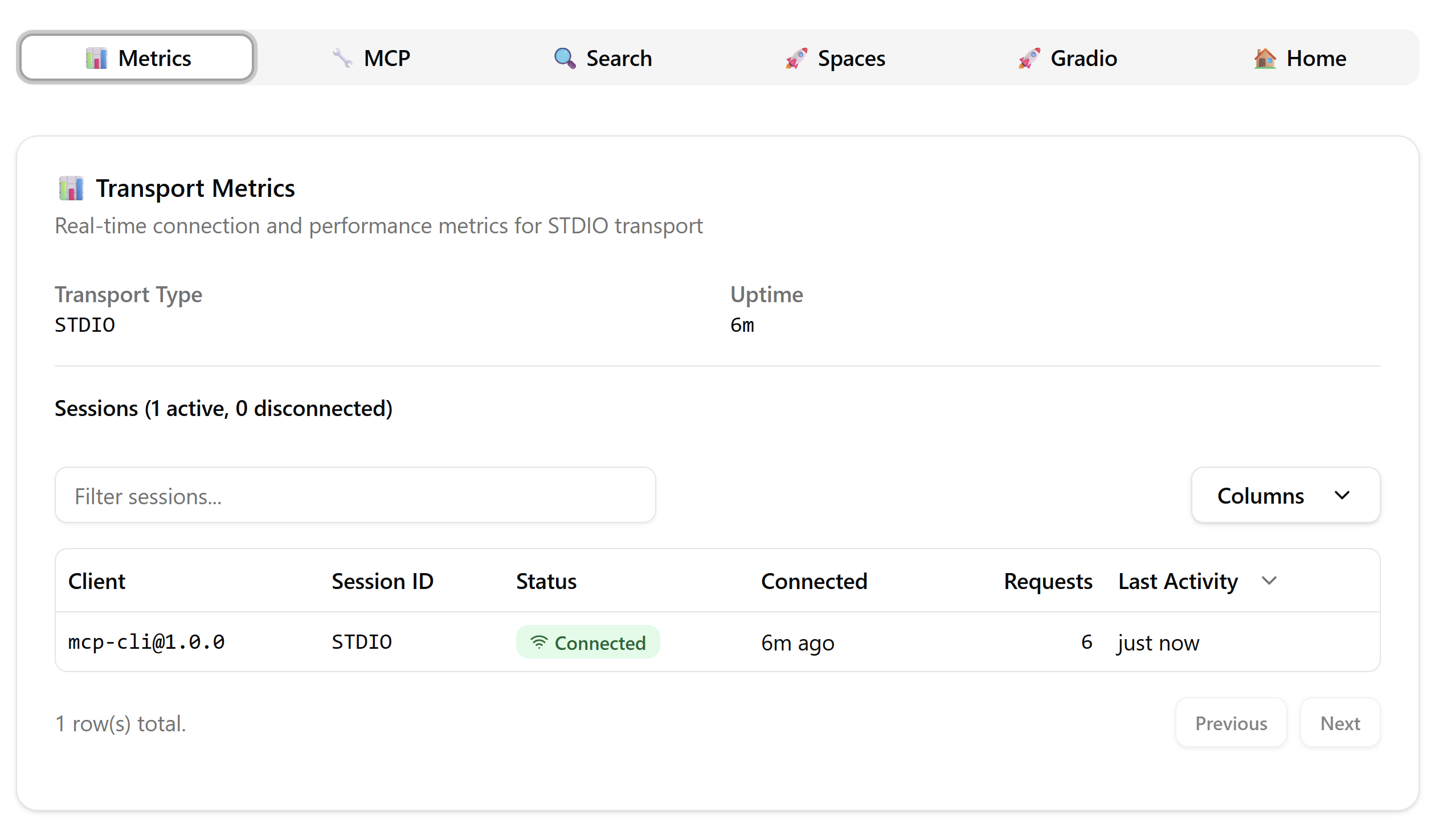 TRANSPORT: The transport type to use (stdio, sse, streamableHttp, or streamableHttpJson)DEFAULT_HF_TOKEN:⚠️ Requests are serviced with the HF_TOKEN received in the Authorization: Bearer header. The DEFAULT_HF_TOKEN is used if no header was sent. Only set this in Development / Test environments or for local STDIO Deployments.⚠️ - If running with