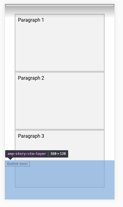 <amp-story-cta-layer>element must be the last layer within an<amp-story-page>. As a result, effectively every<amp-story-page>can have exactly one or exactly zero of the<amp-story-cta-layer>element. - Positioning and sizing of this layer cannot be controlled. It is always 100% width of the page, 20% height of the page, and aligned to the bottom of the page.