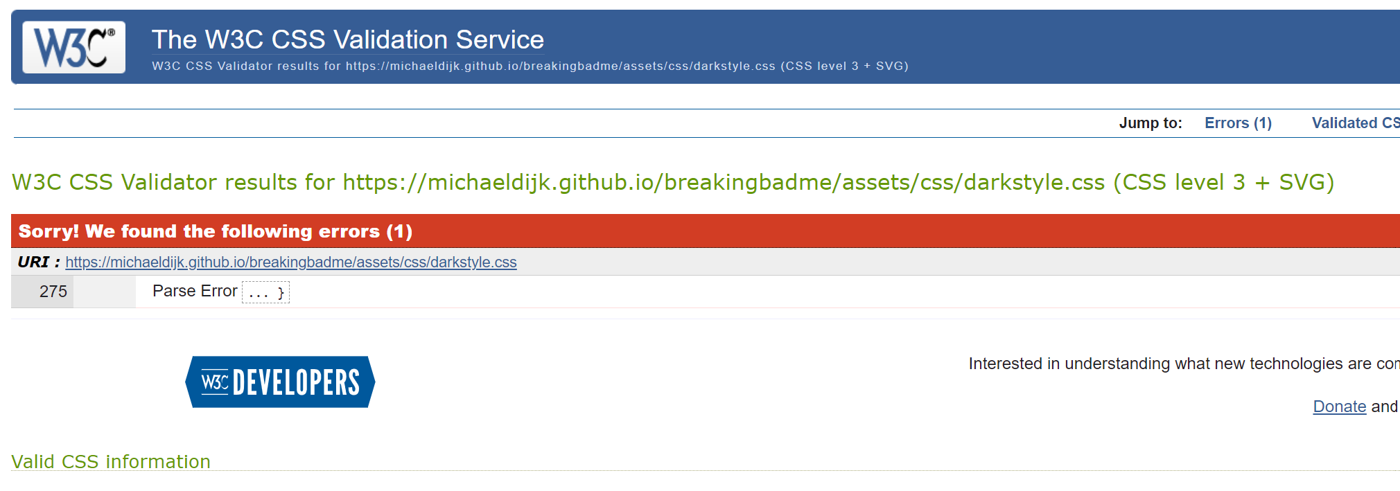 - Codepen | Sanne van Tongelen - Used this quiz example, and adjusted it to suit my site/needs, as I wanted to create a quiz as addition to my other options (API integration (leafletJS maps / breakingbad API)), this example showed exactly how to create a simple quiz. I then incorporated a difficulty level, option, a modal to explain the options / use, and a restart at the end of the game, for both win & loosing. Code has been atributed correctly.