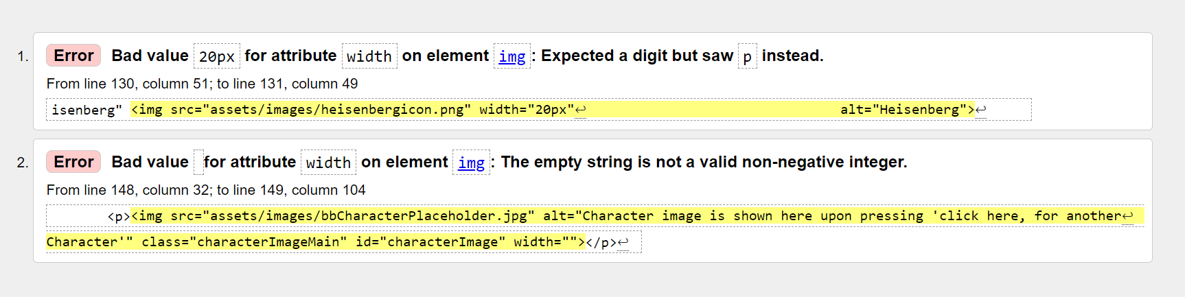 console.loglines, to confirm the output of each function, before removing theconsole.logline itself. This allowed me to confirm that when for instance, on thecharacters.htmlpage, the random character name was loaded in, it logged to console. In the beginning when this didn't work, I had to add it as a callback to the original script. I also added several alert functions, to catch the error, if the script was broken. - Intentionally, when the script was written, I "broke" the script, so it would go to the else statement, showing it was erroring the code, meaning it didn't work. Then adjusting it back to the correct way, confirmed the code worked.