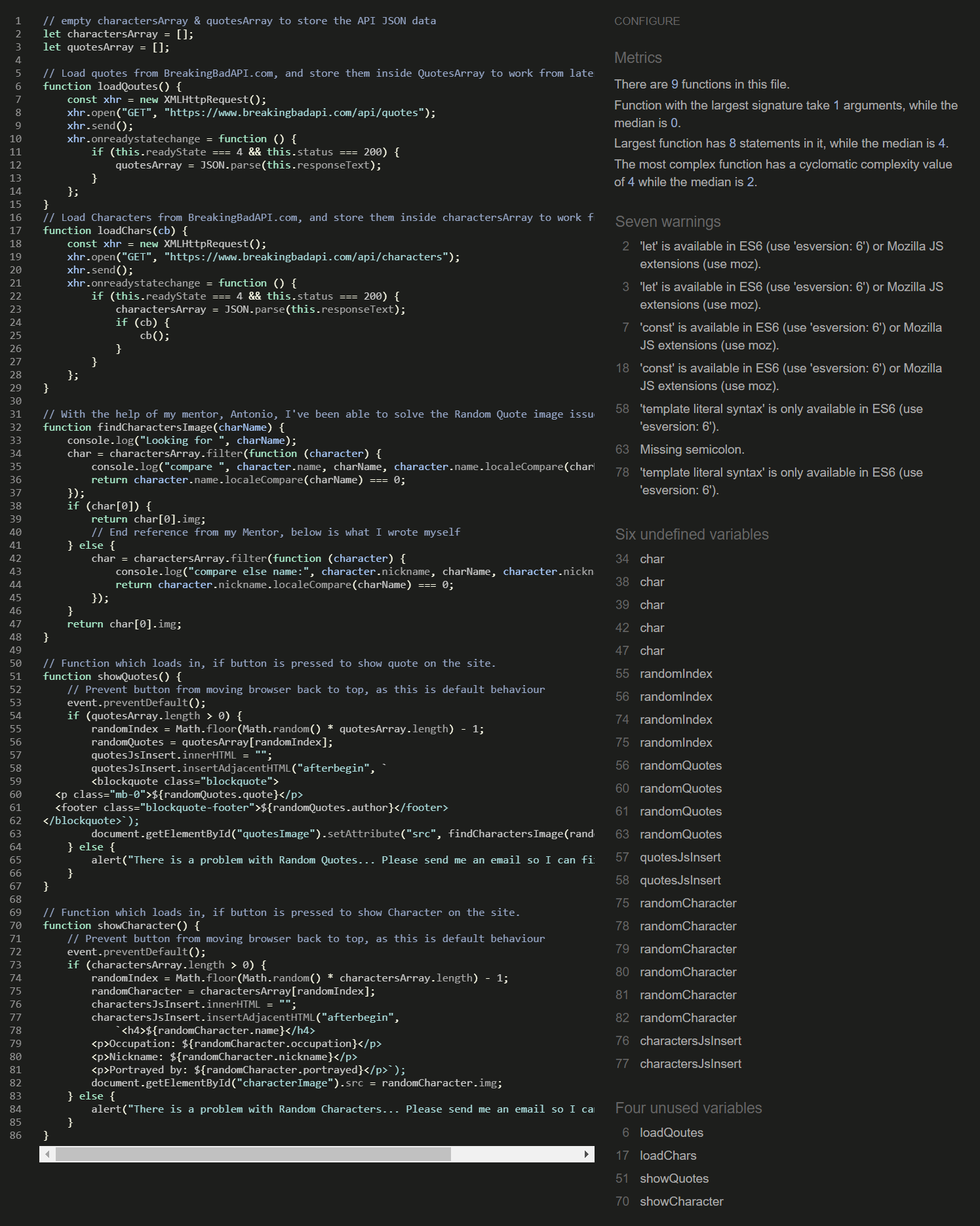- The Breaking Bad API - Used to create / generate the API results for the Characters and Quote section on the index page, and also on the separate Characters page