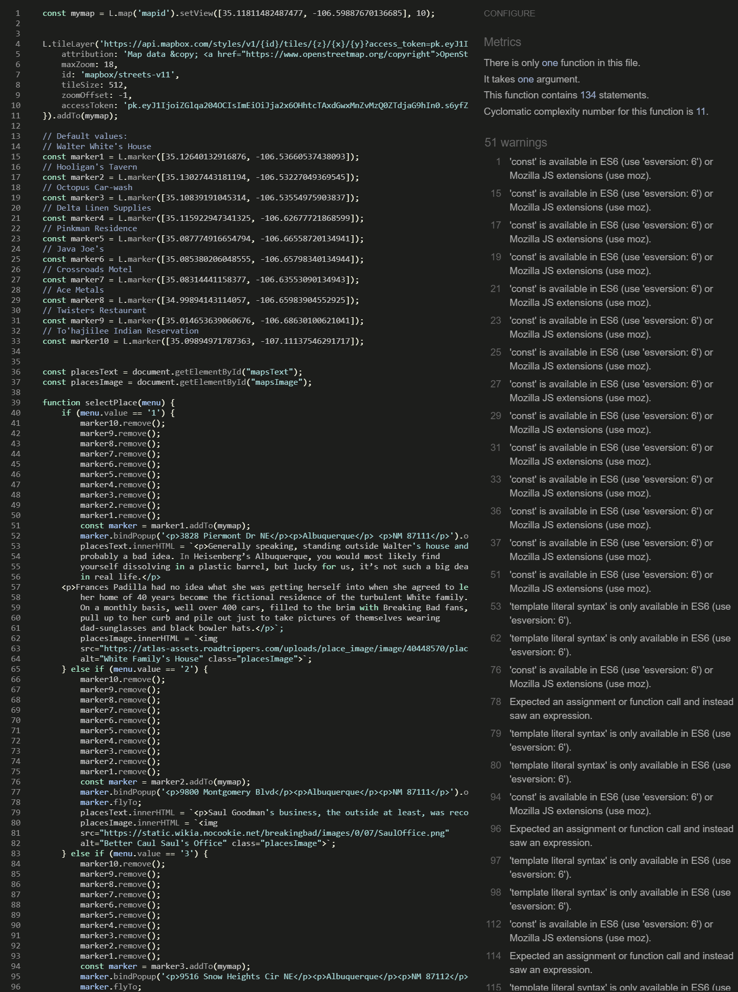I am making an interactive FAN site, about Breaking Bad, called breakingBadMe, with interactivity coming from several APIs, feeding into different parts of the site, it also incorporates a quiz, locations page, and the locations page uses leafletJS, as opposed to Google Maps.