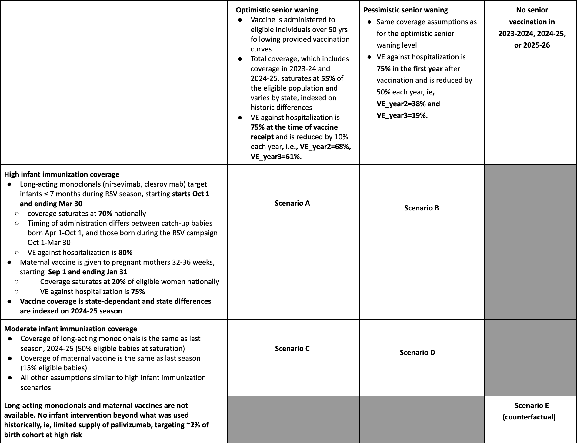 | Scenario A. Optimistic senior waning and high coverage of infant interventions | optSenWan_highInfCov | A-2025-10-31 |