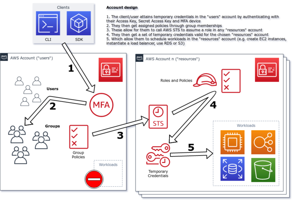 The kickstarter is using the paradigm of a MFA-enabled account assumption model, whereas users aren't granted permissions directly for their users, but rather will have to [assume certain roles] in order to carry out activities (e.g. starting workloads, creating resources, saving files etc.). They can do this either in the web console, or, preferably, using the API (e.g. through this kickstarter using Terraform).