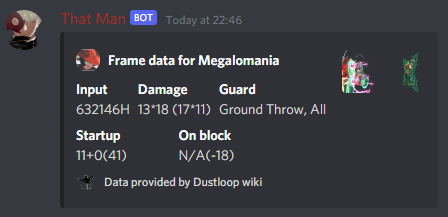 All frame data is fetched from the Dustloop Wiki, many thanks to them for providing data, helping accessing their APIs and testing this bot.