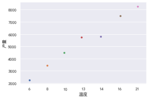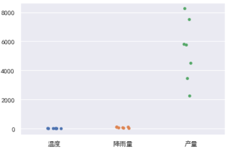 sns.stripplot(x=df['温度'],y=df['产量']);