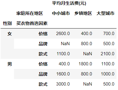 pd.pivot_table(df,values=['平均月生活费(元)'],columns='家庭所在地区',index=['性别','买衣物首选因素'],aggfunc=np.sum)