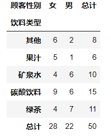 pd.crosstab(df['饮料类型'],df['顾客性别'],margins=True,margins_name='总计')