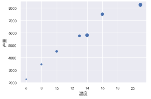 sns.scatterplot(x=df['温度'], y=df['产量'], s=df['降雨量']);