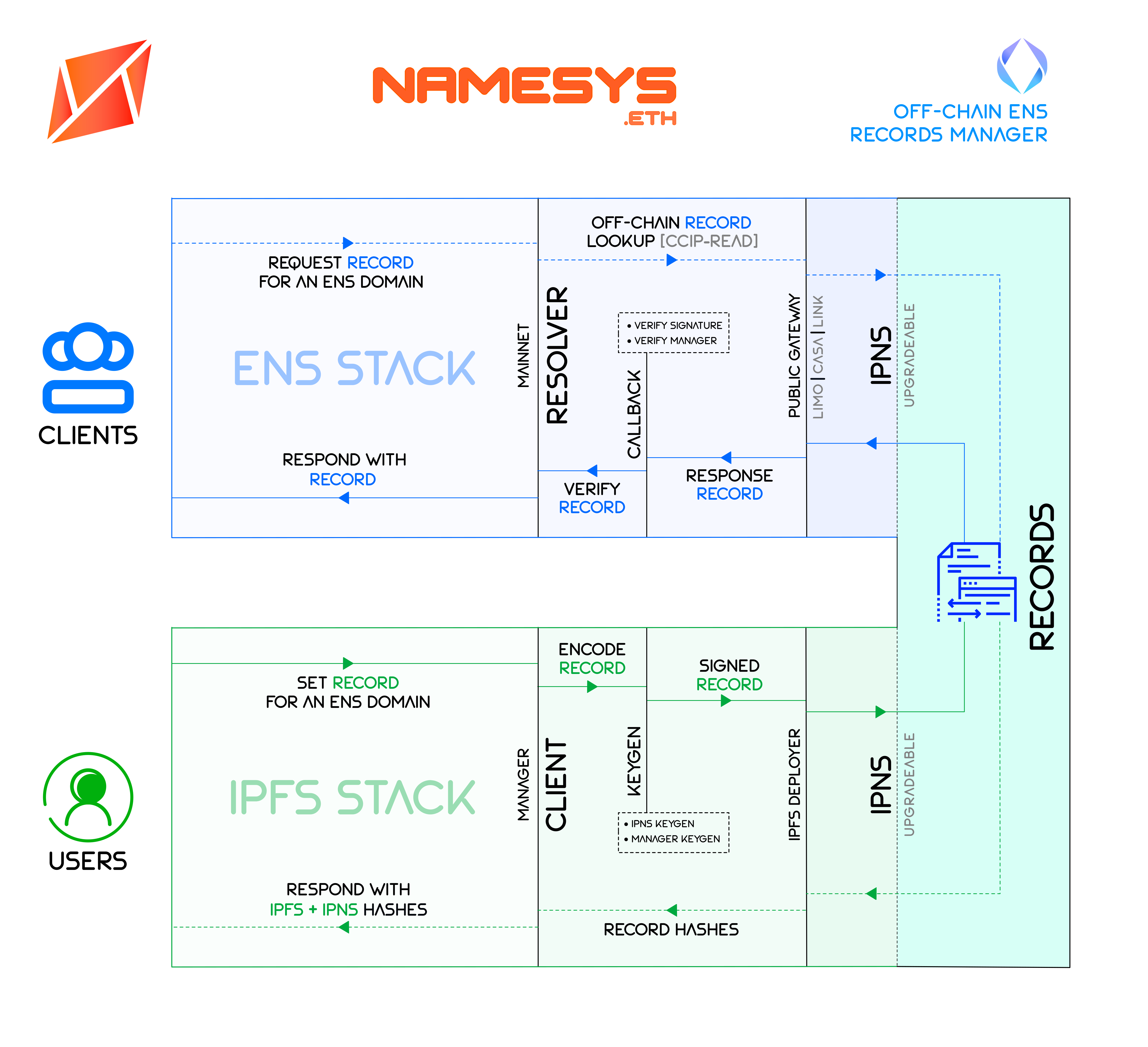 The answer is naturally YES, and today is the day when we deliver to you the ultimate free stuff! NameSys is an Off-Chain ENS Records Manager which allows users to host their ENS records off-chain on IPNS in an autonomous and gasless fashion. The off-chain records are resolved using CCIP-Read by a custom resolver (called CCIP2) capable of reading records from IPNS.