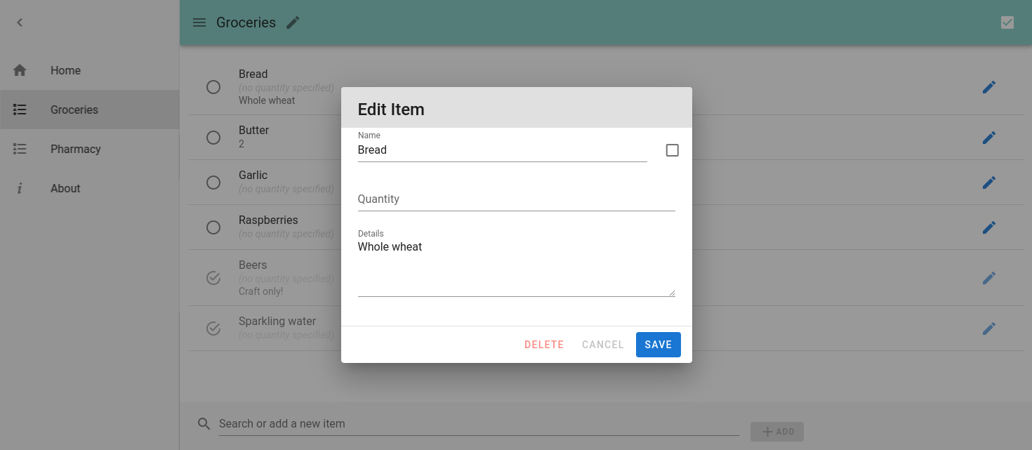 - Items with the following fields: name, quantity, details