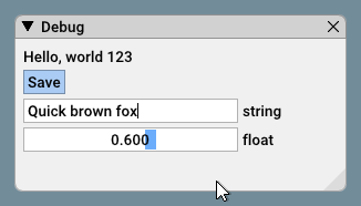 ImGui::SliderFloat("float", &f, 0.0f, 1.0f);Result: