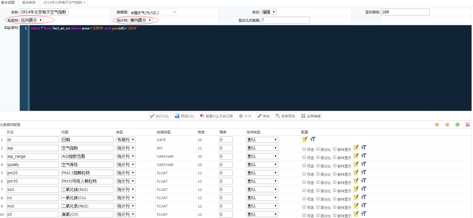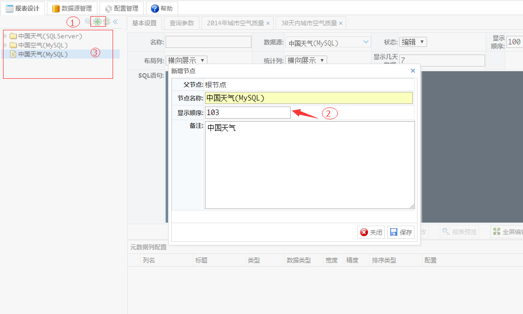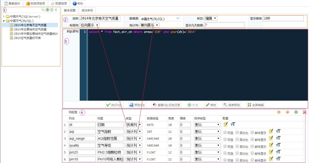 报表的基本设置由4部分组成(如上图所示):报表树型列表、报表基本属性、报表SQL查询语句、报表元数据列配置。