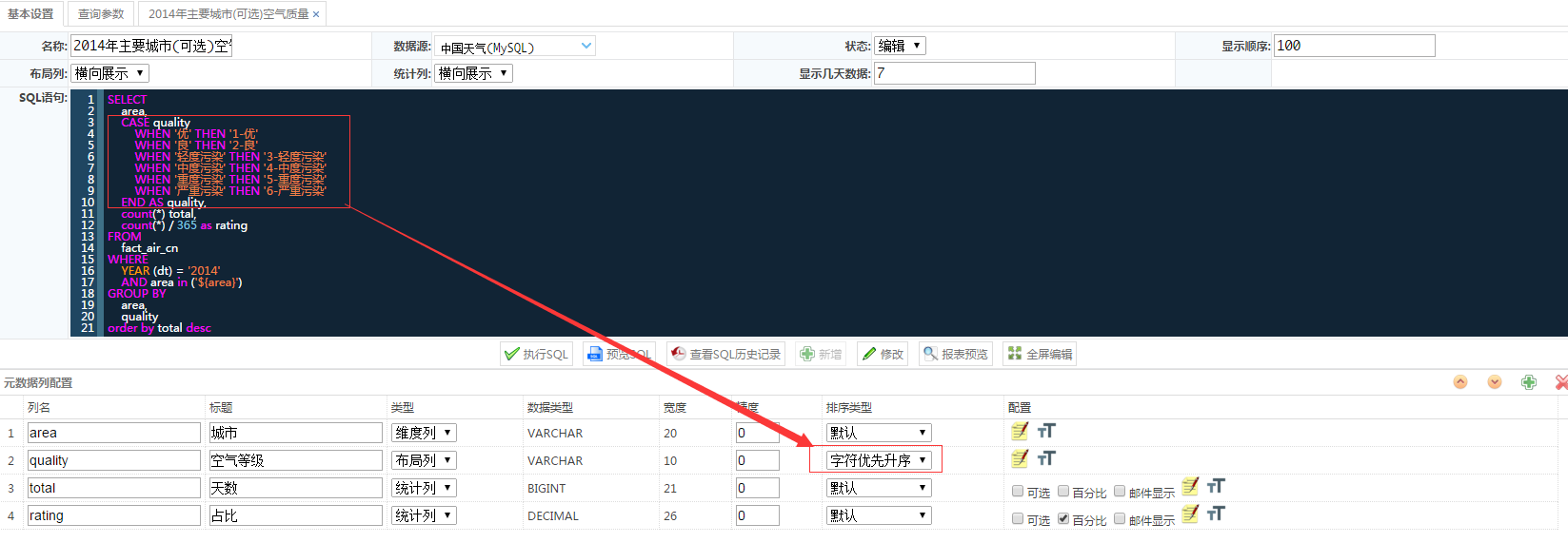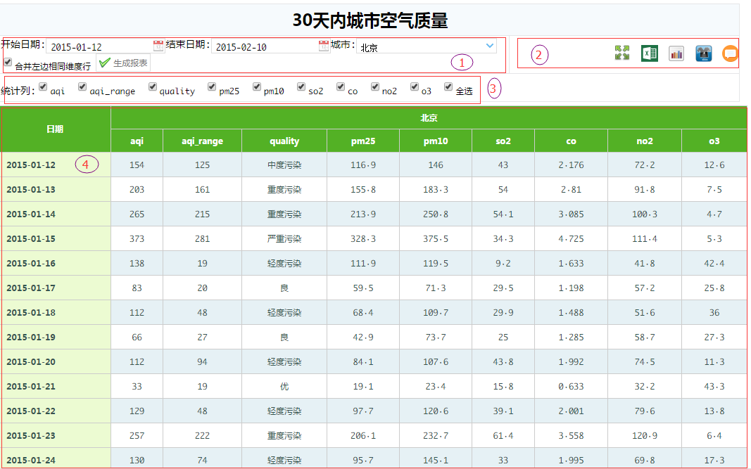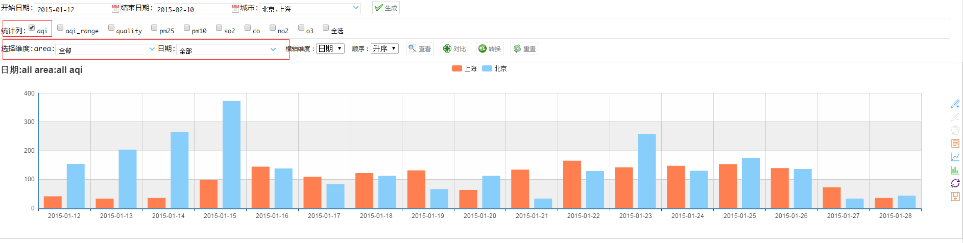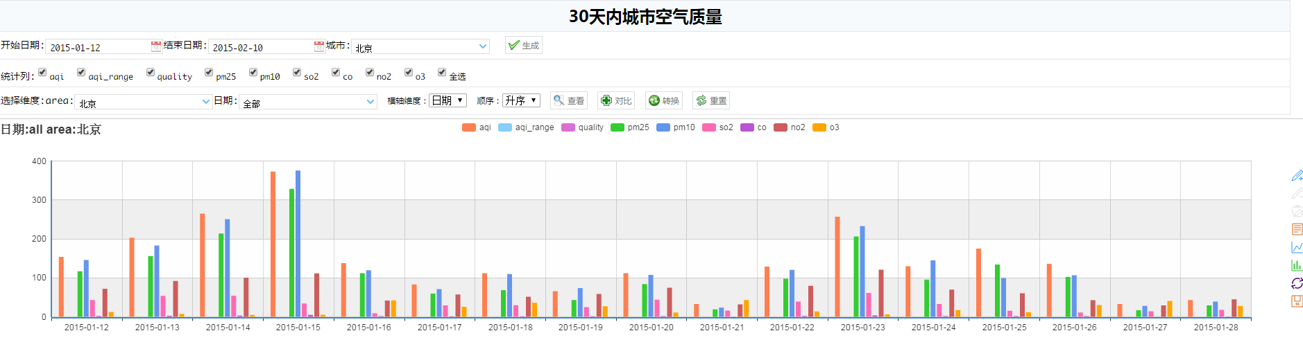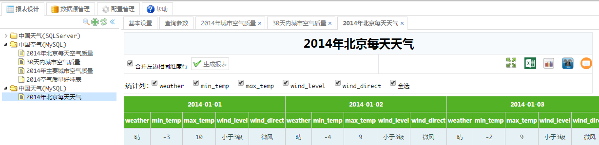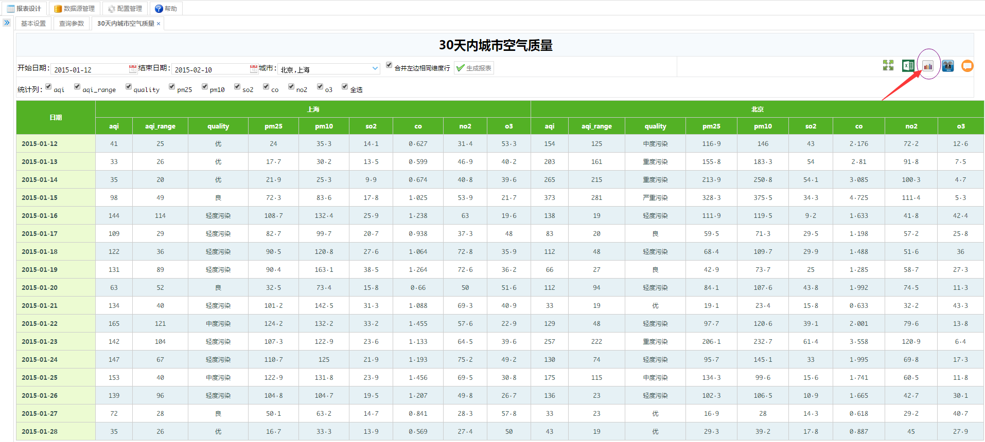 示例中的所有数据来源于:pm25.in、aqistudy,如果您需要运行示例中的报表,需求在mysql中创建名为china_weather_air的数据库, 然后解压yourgitrepository/EasyReport/docs/db/mysql.zip,并执行china_weather_air_mysql.sql创建表结构与导入初始数据。