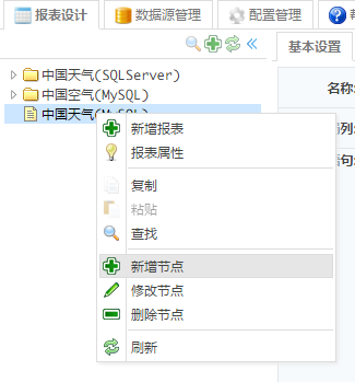 通常,只要把数据源配置成功就可以开始报表设计了,报表设计主要分两个步骤:基本设置与查询参数设置。且必须先把基本设置保存后方可进行查询参数设置 ,查询参数设置是可选的,主要看报表设计者的意图。